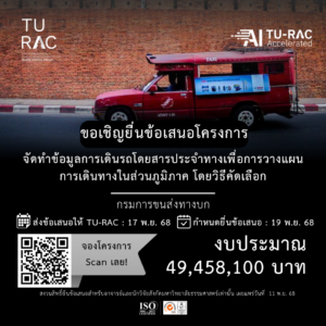 ✨ TU-RAC ขอเชิญยื่นข้อเสนอโครงการจัดทำข้อมูลการเดินรถโดยสารประจำทางเพื่อการวางแผนการเดินทางในส่วนภูมิภาค โดยวิธีคัดเลือก