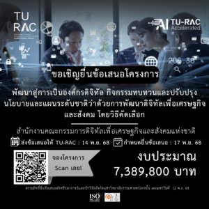 ✨ TU-RAC ขอเชิญยื่นข้อเสนอโครงการพัฒนาสู่การเป็นองค์กรดิจิทัล กิจกรรมทบทวนและปรับปรุงนโยบายและแผนระดับชาติว่าด้วยการพัฒนาดิจิทัลเพื่อเศรษฐกิจและสังคม โดยวิธีคัดเลือก