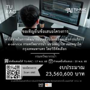 TU-RAC ขอเชิญยื่นข้อเสนอโครงการค่าใช้จ่ายในการพัฒนาระบบเชื่อมโยงข้อมูลเพื่อการบริการ e-service กรมทรัพยากรน้ำ แขวงพญาไท เขตพญาไท กรุงเทพมหานคร โดยวิธีคัดเลือก