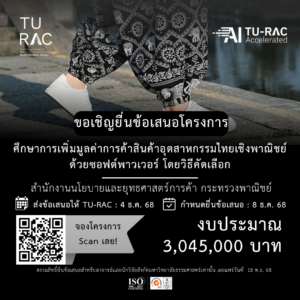 TU-RAC ขอเชิญยื่นข้อเสนอโครงการศึกษาการเพิ่มมูลค่าการค้าสินค้าอุตสาหกรรมไทยเชิงพาณิชย์ด้วยซอฟต์พาวเวอร์ โดยวิธีคัดเลือก