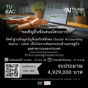 ✨ TU-RAC ขอเชิญยื่นข้อเสนอโครงการจัดทำฐานข้อมูลบัญชีเมตริกส์สังคม (Social Accounting Matrix : SAM) เพื่อวิเคราะห์ผลกระทบด้านเศรษฐกิจอุตสาหกรรมของประเทศ