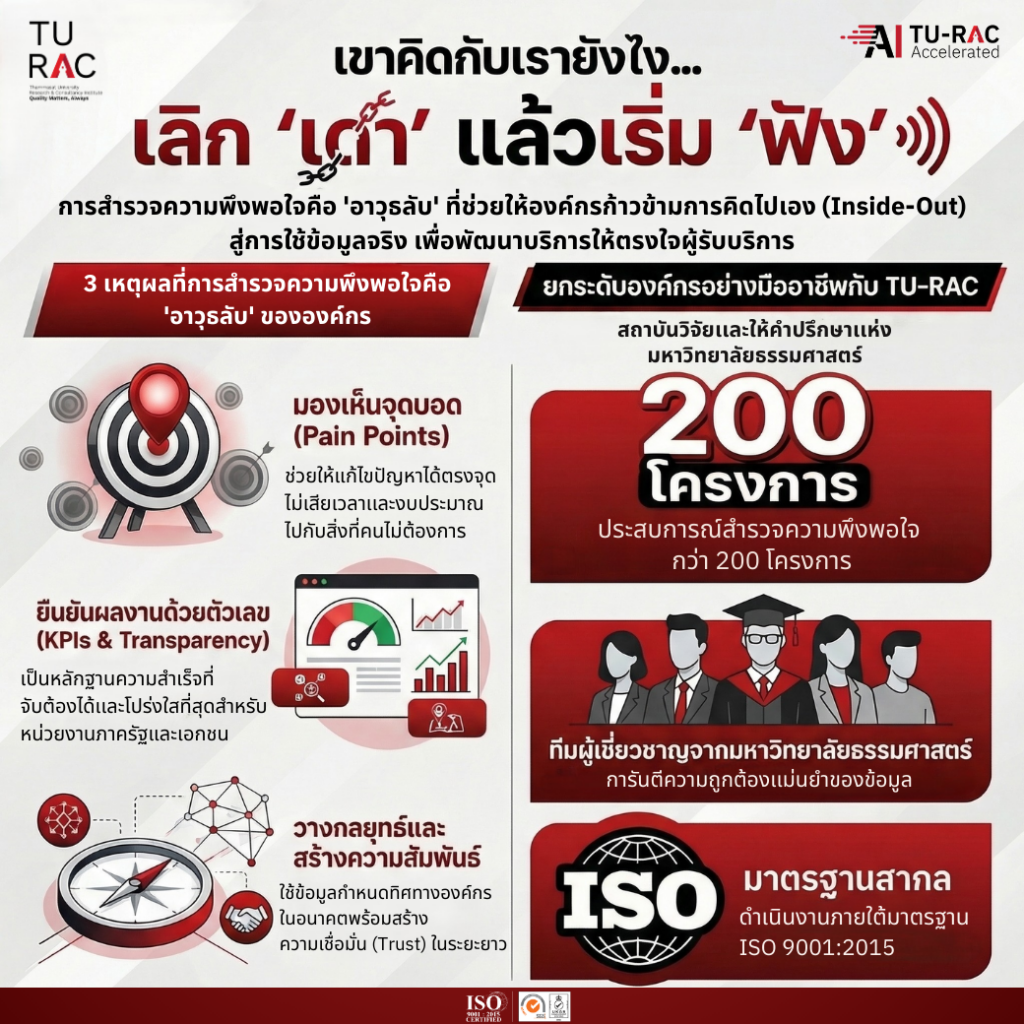 Whether you are a government agency seeking to meet PMQA 4.0 (Public Sector Management Quality Award 4.0) standards, or a private company looking to deeply understand your customers and employees… let TU-RAC and our team of experts from Thammasat University be your partner.