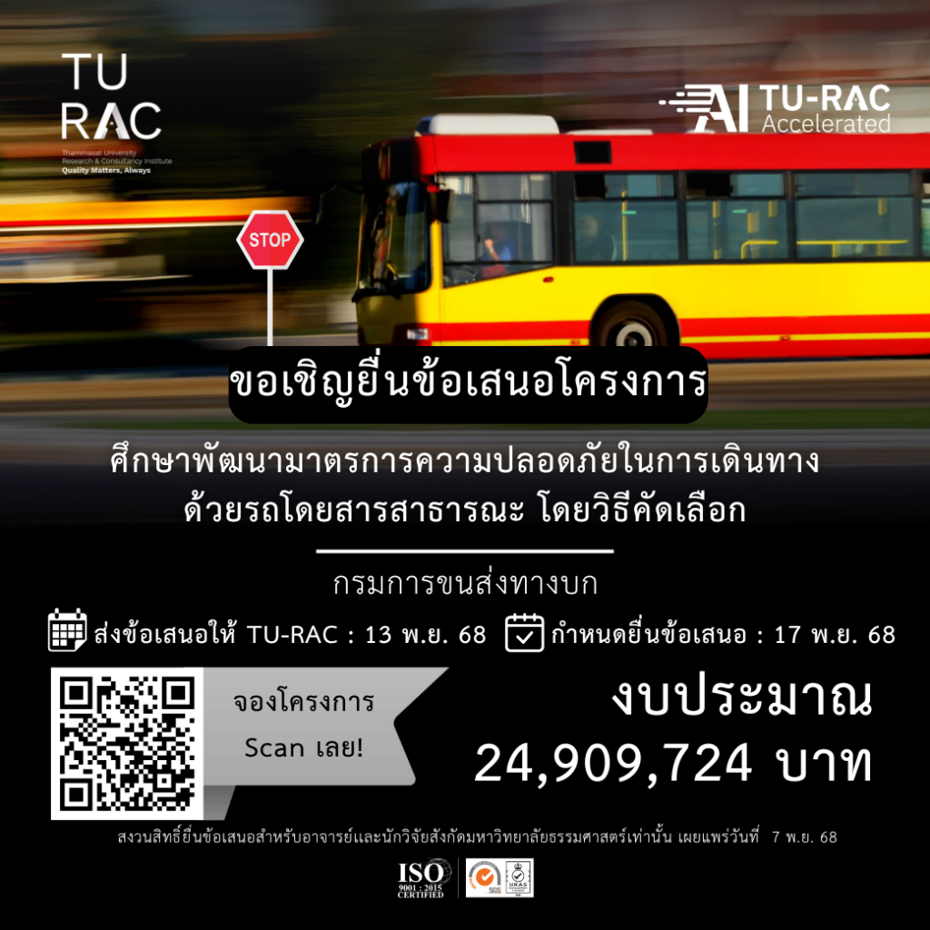 ✨ TU-RAC ขอเชิญยื่นข้อเสนอโครงการศึกษาพัฒนามาตรการความปลอดภัยในการเดินทางด้วยรถโดยสารสาธารณะ โดยวิธีคัดเลือก
