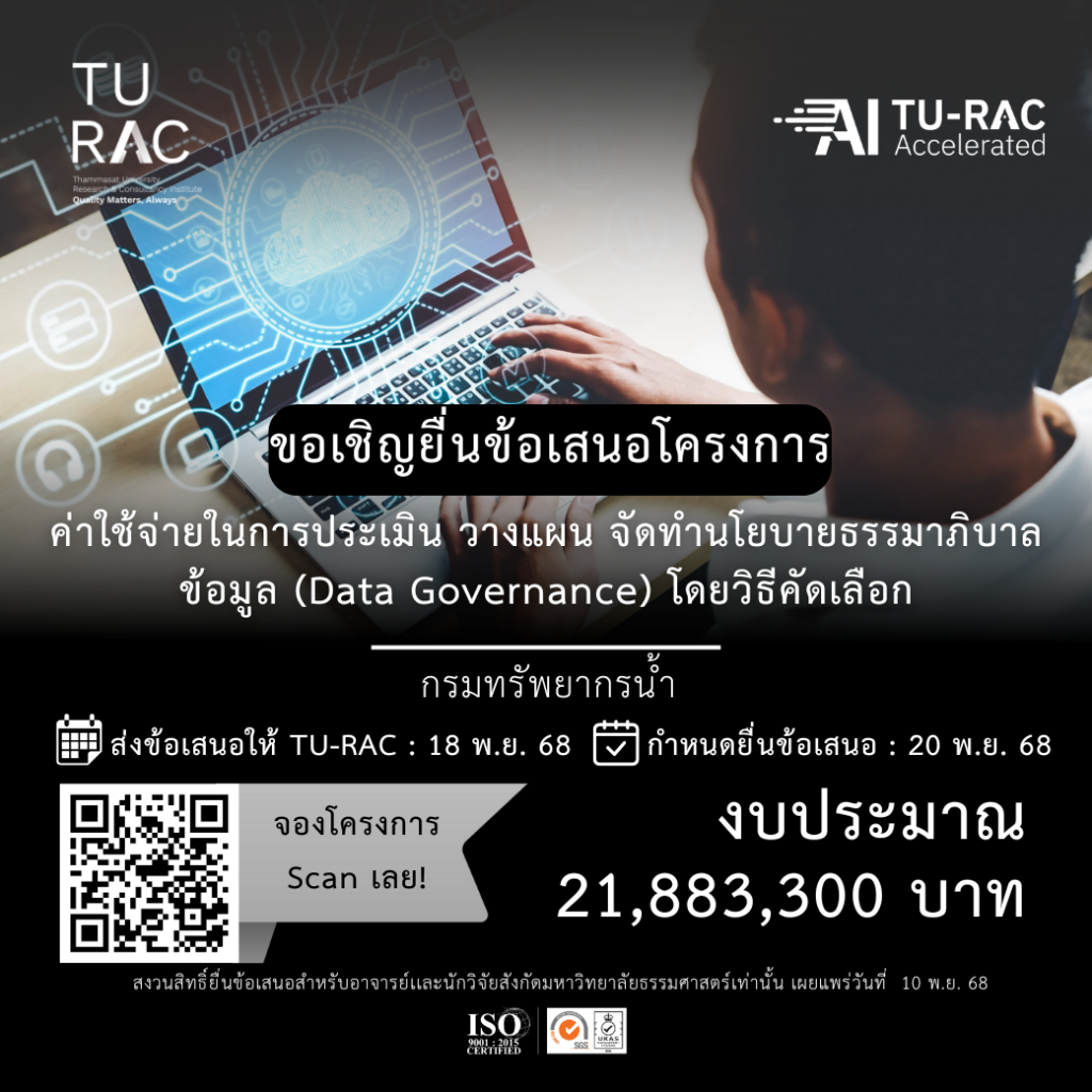 ✨ TU-RAC ขอเชิญยื่นข้อเสนอโครงการค่าใช้จ่ายในการประเมิน วางแผน จัดทำนโยบายธรรมาภิบาลข้อมูล (Data Governance) โดยวิธีคัดเลือก