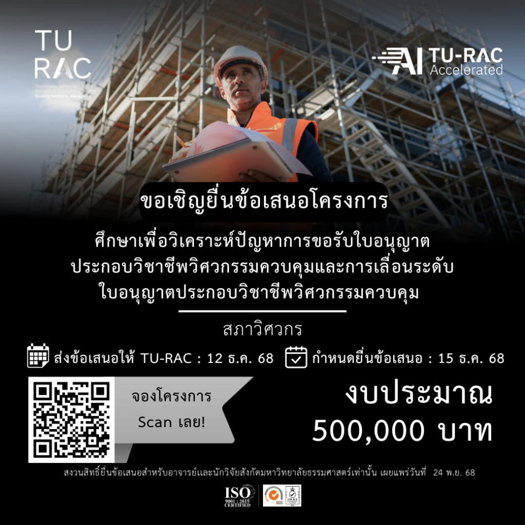 TU-RAC ขอเชิญยื่นข้อเสนอโครงการศึกษาเพื่อวิเคราะห์ปัญหาการขอรับใบอนุญาตประกอบวิชาชีพวิศวกรรมควบคุมและการเลื่อนระดับใบอนุญาตประกอบวิชาชีพวิศวกรรมควบคุม