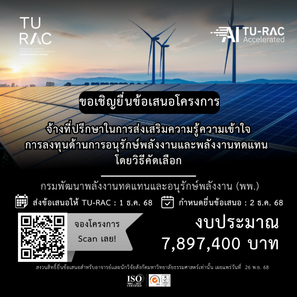 TU-RAC ขอเชิญยื่นข้อเสนอโครงการ: จ้างที่ปรึกษาในการส่งเสริมความรู้ความเข้าใจการลงทุนด้านการอนุรักษ์พลังงานและพลังงานทดแทน โดยวิธีคัดเลือก 💡