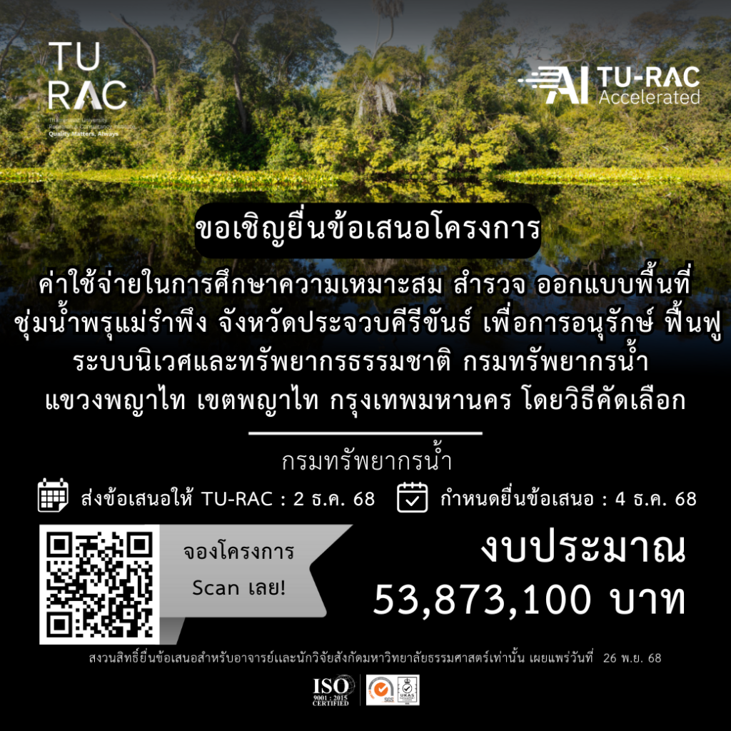 TU-RAC ขอเชิญยื่นข้อเสนอโครงการค่าใช้จ่ายในการศึกษาความเหมาะสม สำรวจ ออกแบบพื้นที่ชุ่มน้ำพรุแม่รำพึง จังหวัดประจวบคีรีขันธ์ เพื่อการอนุรักษ์ ฟื้นฟูระบบนิเวศและทรัพยากรธรรมชาติ กรมทรัพยากรน้ำ แขวงพญาไท เขตพญาไท กรุงเทพมหานคร โดยวิธีคัดเลือก