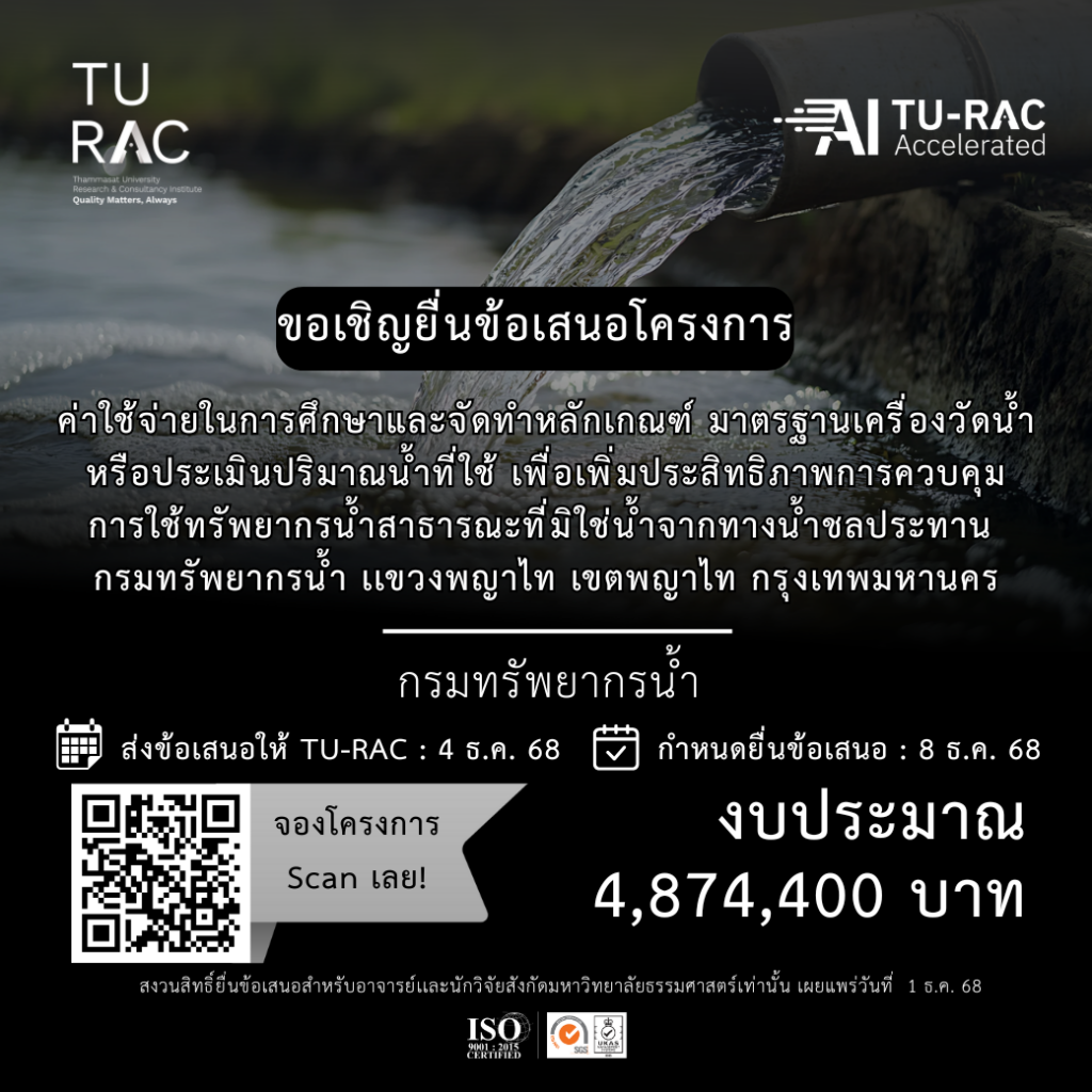 TU-RAC ขอเชิญยื่นข้อเสนอโครงการค่าใช้จ่ายในการศึกษาและจัดทำหลักเกณฑ์ มาตรฐานเครื่องวัดน้ำหรือประเมินปริมาณน้ำที่ใช้ เพื่อเพิ่มประสิทธิภาพการควบคุมการใช้ทรัพยากรน้ำสาธารณะที่มิใช่น้ำจากทางน้ำชลประทาน กรมทรัพยากรน้ำ เเขวงพญาไท เขตพญาไท กรุงเทพมหานคร