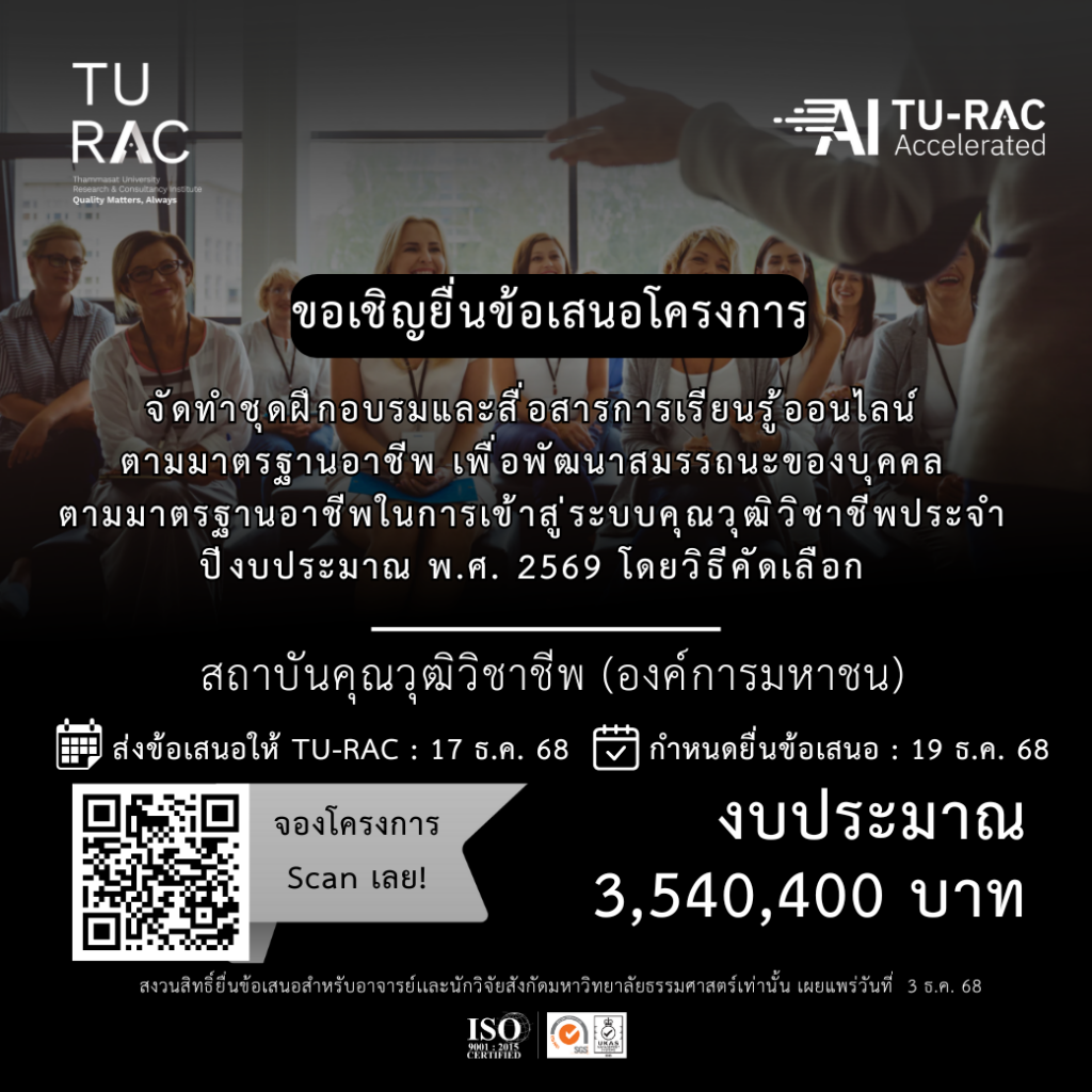 TU-RAC ขอเชิญยื่นข้อเสนอโครงการจัดทำชุดฝึกอบรมและสื่อสารการเรียนรู้ออนไลน์ตามมาตรฐานอาชีพเพื่อพัฒนาสมรรถนะของบุคคลตามมาตรฐานอาชีพในการเข้าสู่ระบบคุณวุฒิวิชาชีพประจำปีงบประมาณ พ.ศ. 2569 โดยวิธีคัดเลือก 💻